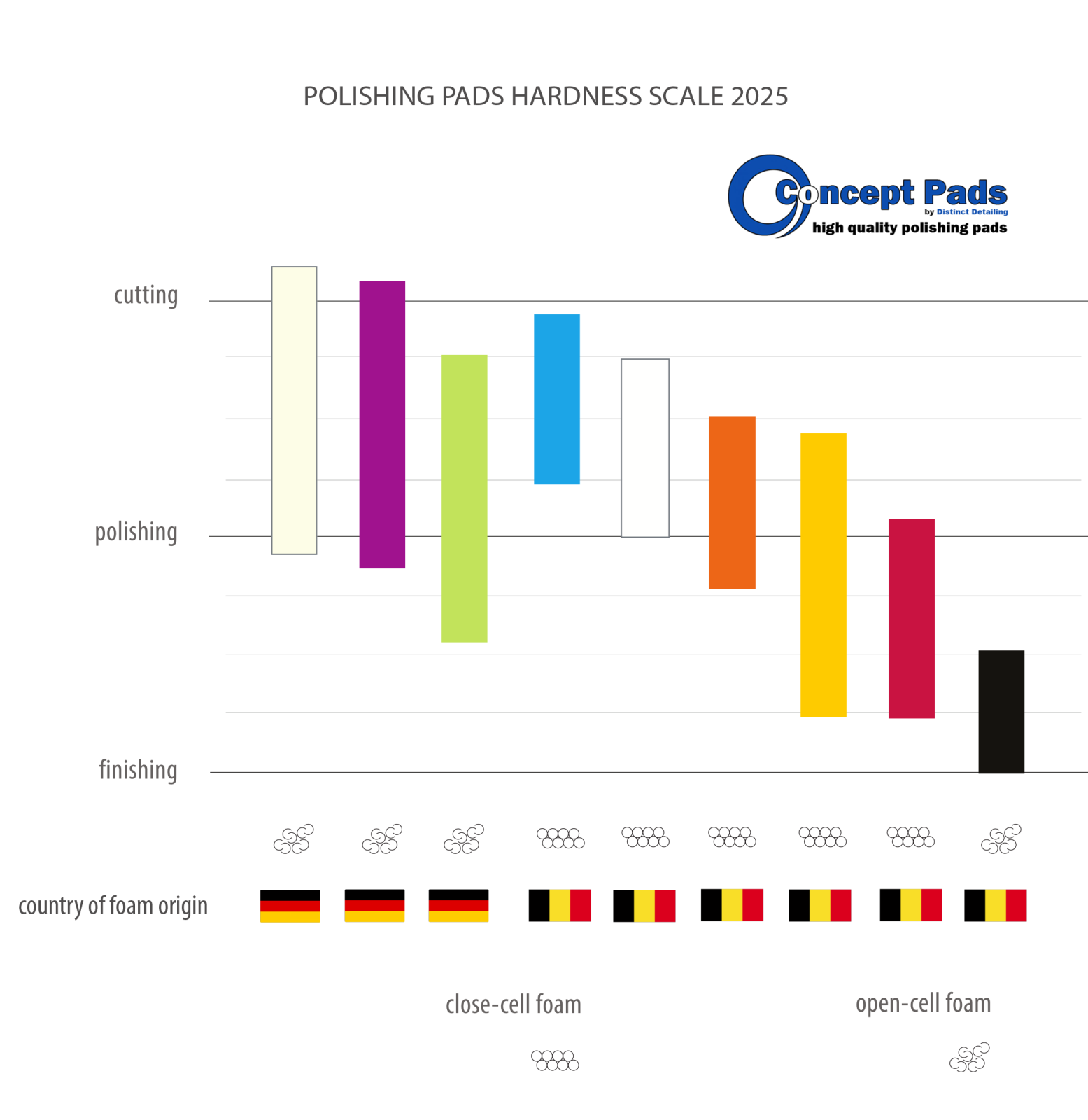Structura spumei menține pasta abrazivă pe suprafața pad-ului asigurând utilizarea deplină a proprietăților abrazive ale acesteia. Utilizarea pad-urilor din spumă albă este recomandată pentru etapa de tăiere. Totuși, după cum reiese din scala de duritate, spuma albă este ceva mai moale decât spuma albastră dar cu toate acestea, ea este recomandată pentru lucrări de tăiere care produc mai puțină murdărie pe suprafața vopselei.